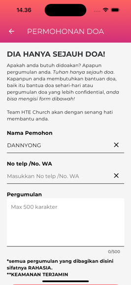 Pada Halaman Dahsboard -> pilih menu Permohonan Doa -> pada halaman permohonan doa isi pergumulan doa -> klik submit.