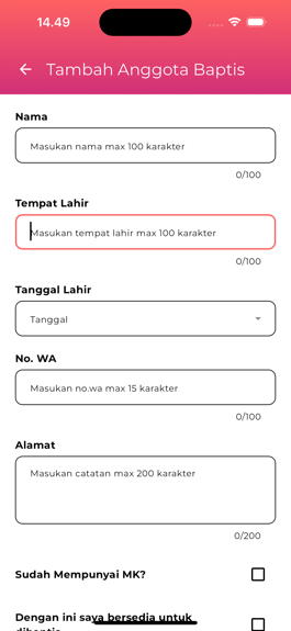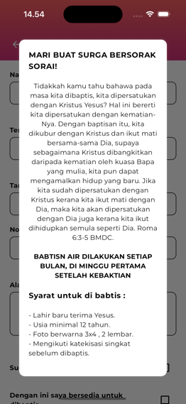 Pada Halaman Dahsboard -> pilih menu Baptis -> pada halaman baptis muncul persyaratan baptis -> klik mengerti -> isikan data yang diminta pada form pembaptisan -> klik submit.